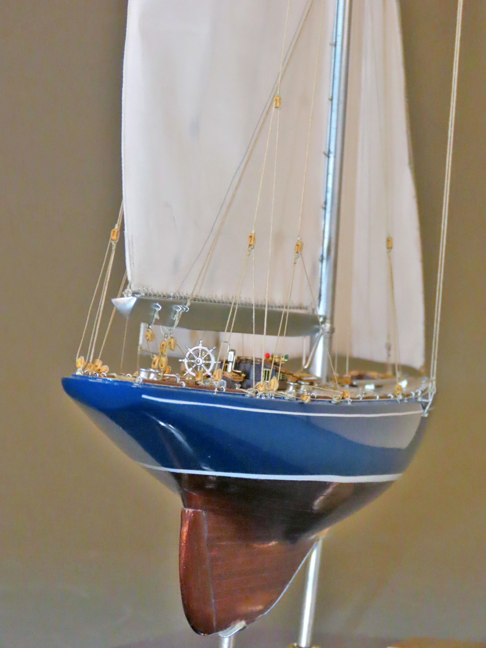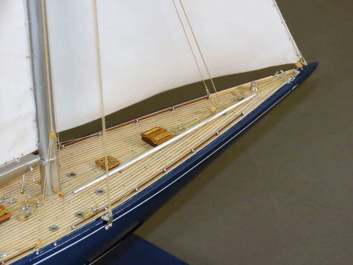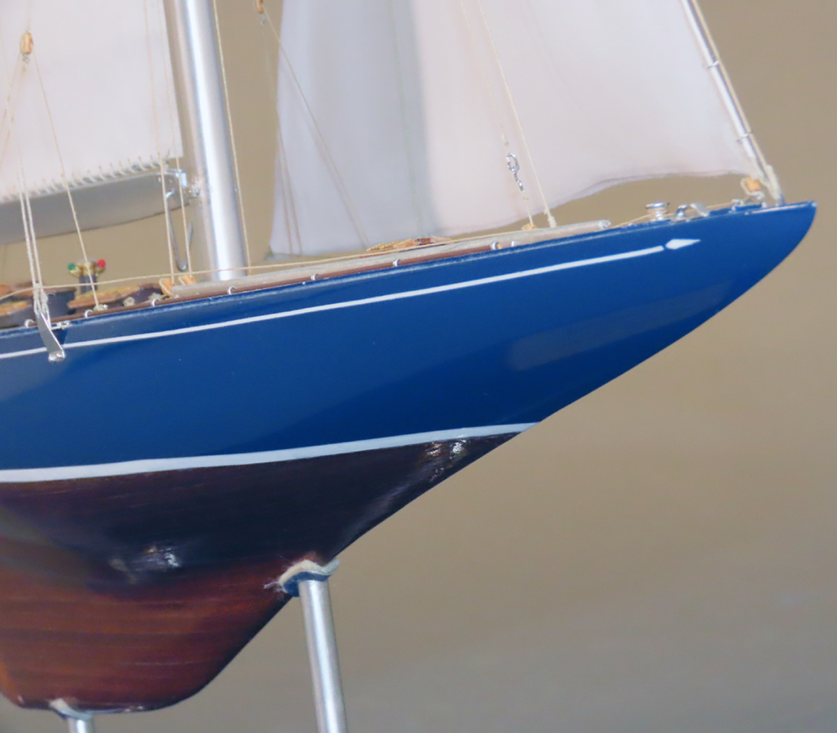 全長130フィート(約40m)Jクラスの大型レーシングヨットです。 船体がとても美しく、是非作ってみたい船の一つでした。 いざ製作にかかると、この美しい船体が難物で、少しの歪や凹みが目立ち、 プライマー、サーフェイサーなど下地処理に苦労することになりました。 しかし、一番時間がかかったのは、塗装です。やり直しもあり、 クリア塗装を含め十数回行うことになりました。クリア塗装はなかなか難しかったです。 なお、自分好みに少しアレンジを加えています。 |