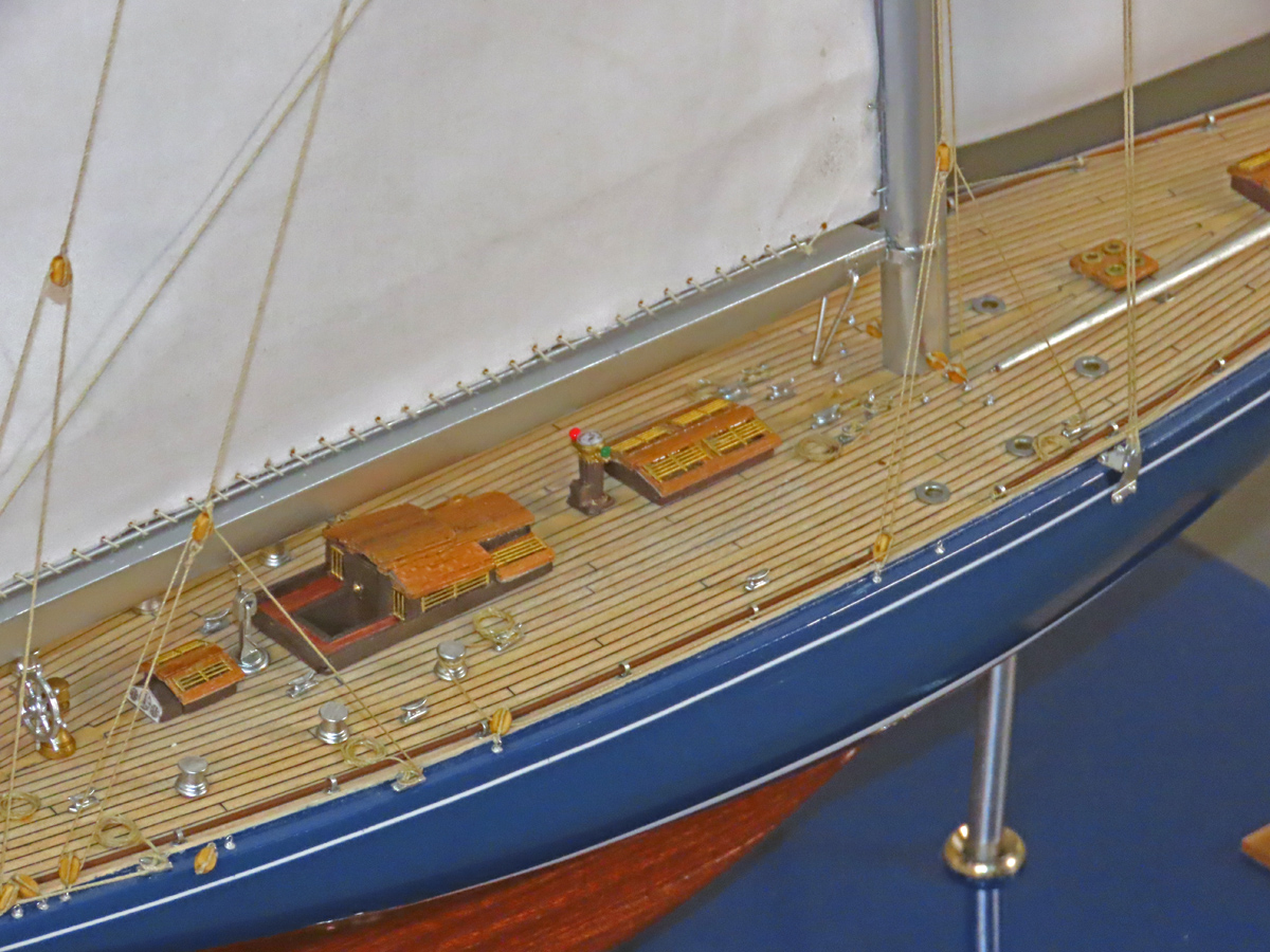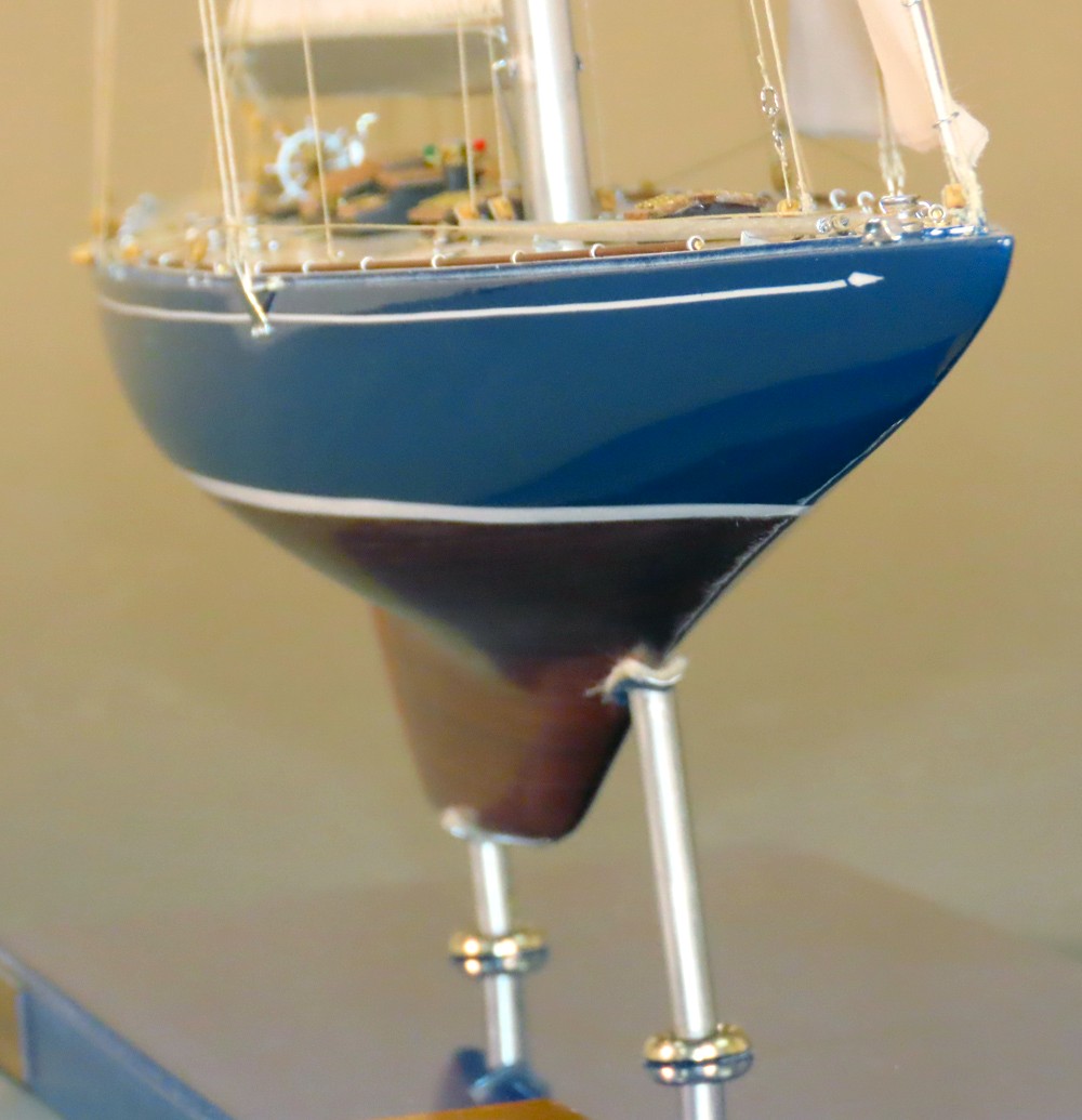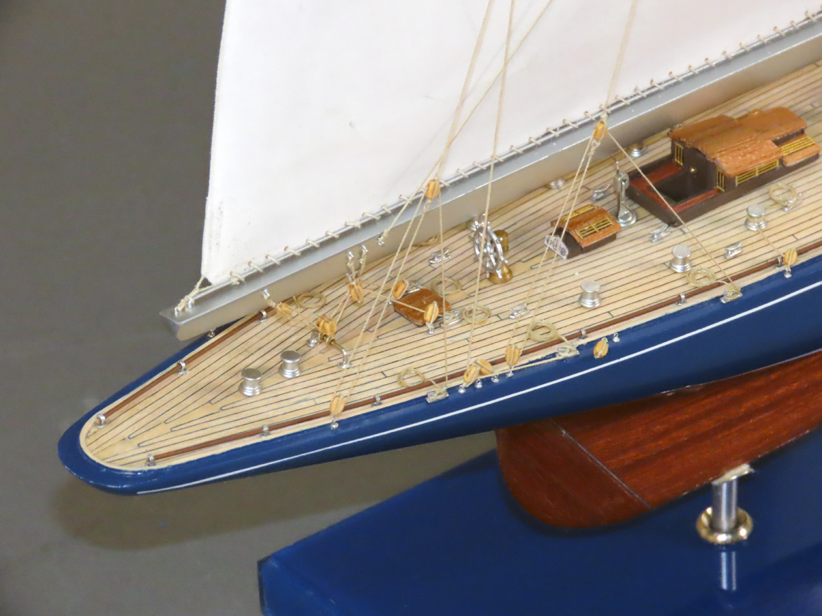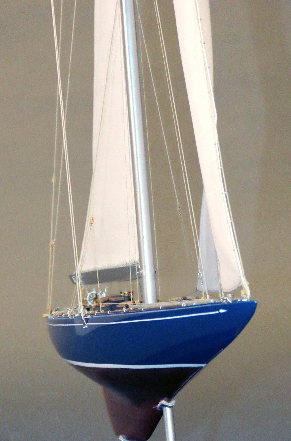 全長130フィート(約40m)Jクラスの大型レーシングヨットです。 船体がとても美しく、是非作ってみたい船の一つでした。 いざ製作にかかると、この美しい船体が難物で、少しの歪や凹みが目立ち、 プライマー、サーフェイサーなど下地処理に苦労することになりました。 しかし、一番時間がかかったのは、塗装です。やり直しもあり、 クリア塗装を含め十数回行うことになりました。クリア塗装はなかなか難しかったです。 なお、自分好みに少しアレンジを加えています。 |