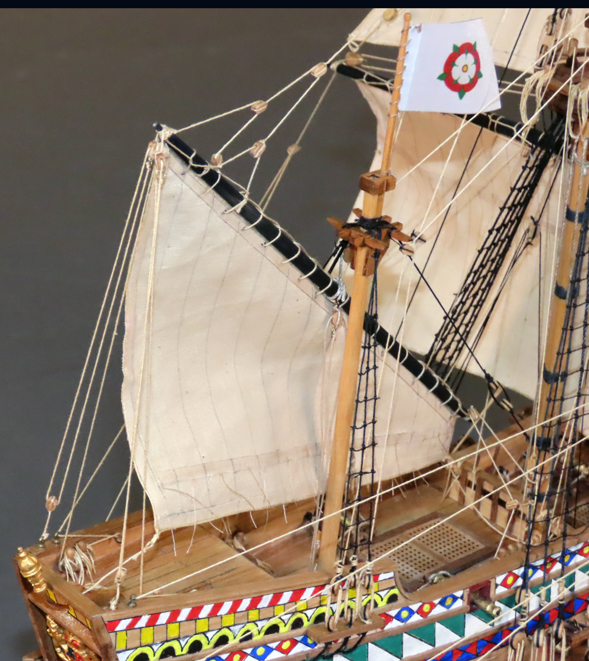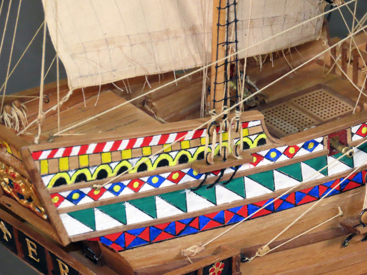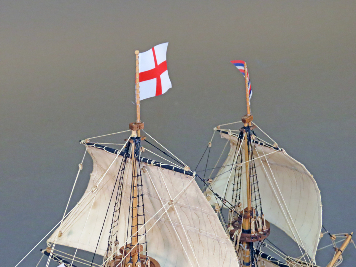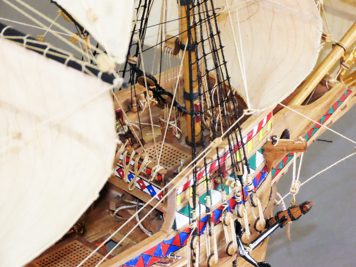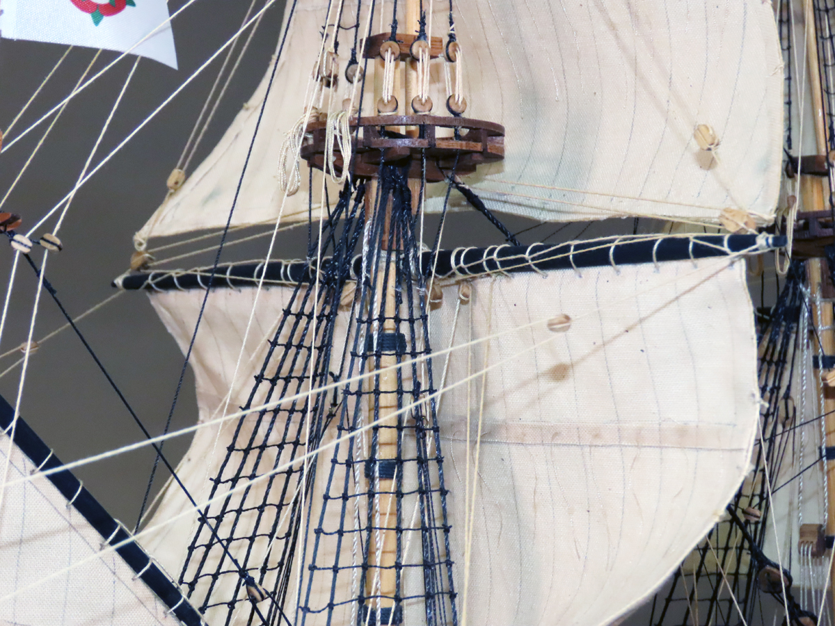 マモリ社のキットはセールが付属しておりませんでしたが、何度もセールを作り直すと共に、 リギングも試行錯誤を繰り返して何とか形にしましたが、展示後に改めてやり変えたいと思っています。