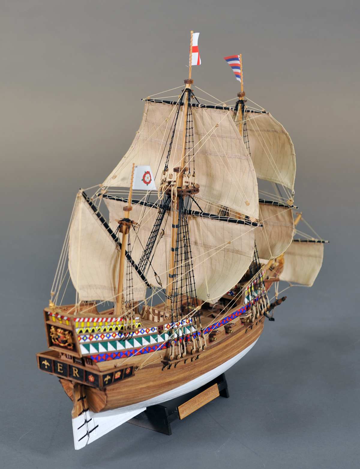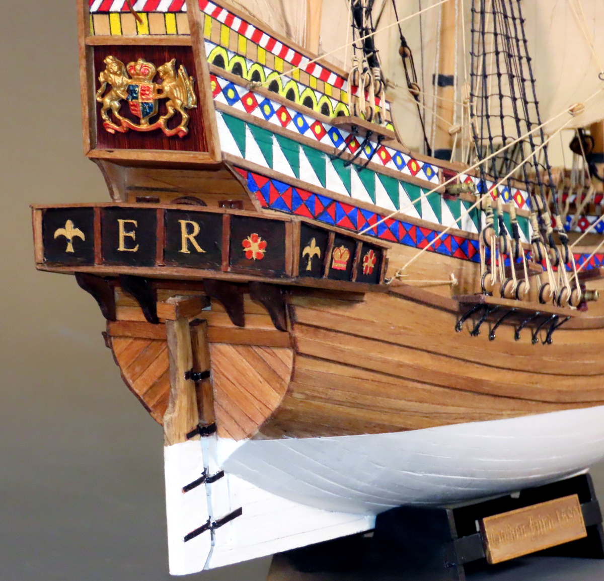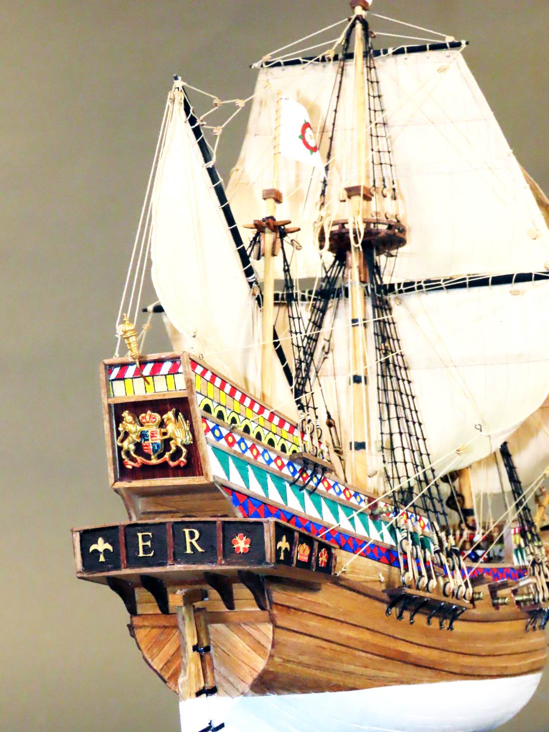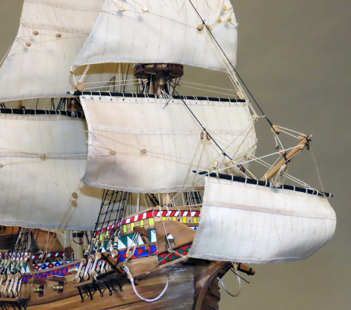 マモリ社のキットはセールが付属しておりませんでしたが、何度もセールを作り直すと共に、 リギングも試行錯誤を繰り返して何とか形にしましたが、展示後に改めてやり変えたいと思っています。