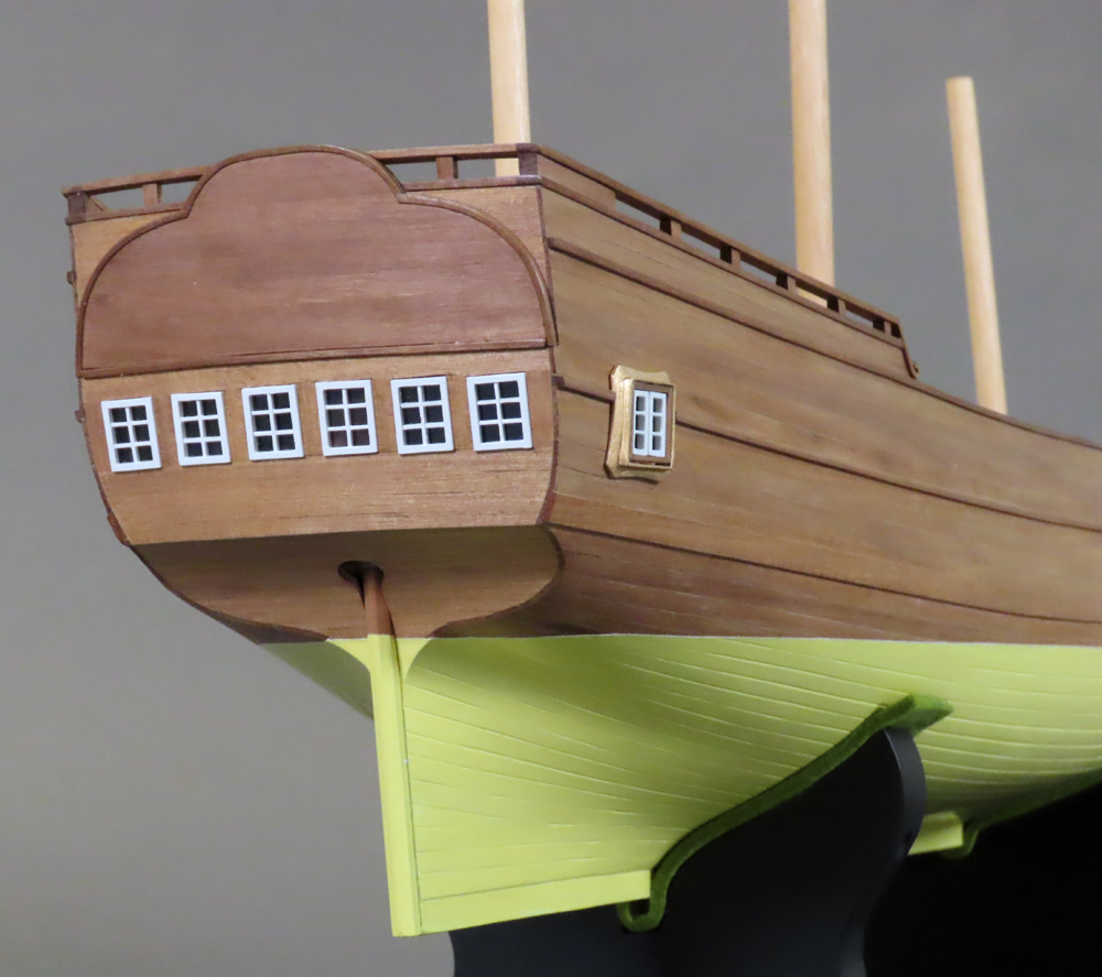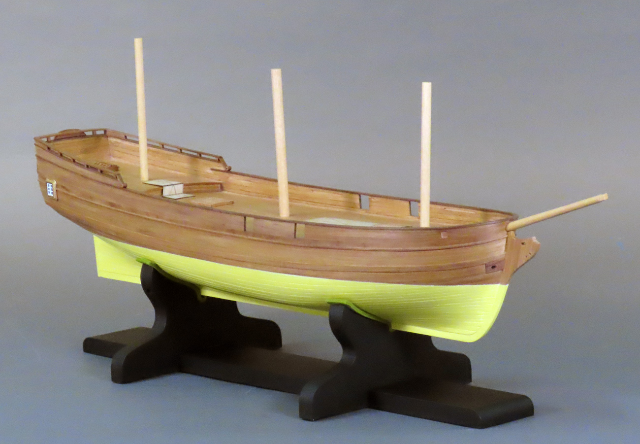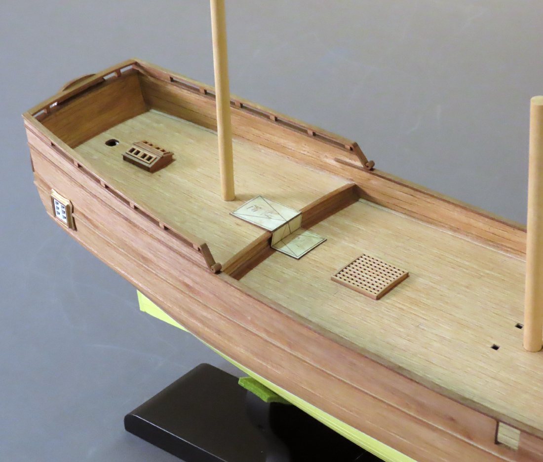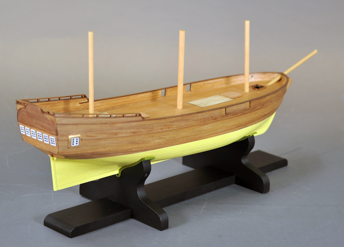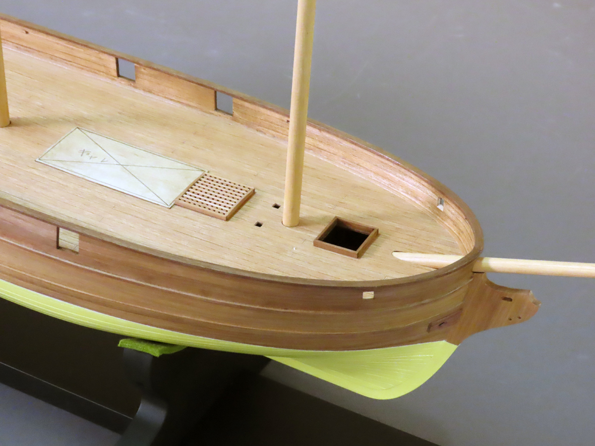 逐次訳本からこの船の要素を抜き書きして計画しました。 3本マスト・トップスル・スクーナーに天井の高い大きなギャレーとキャプスタンがあって、 ボートは3隻以上あります。 図面にするとキャプスタンを操作するときにはギャレーの炉やかまどは全部移動しなければならず、 船長室に舵軸が通っているなど、不可解な配置となりました。 縮尺1/40とするととても大きく、大味にならないよう注意しています。 船底は銅板張の発明前で白塗りですが平板に見えない様に板の継ぎ目を強調しました。 |