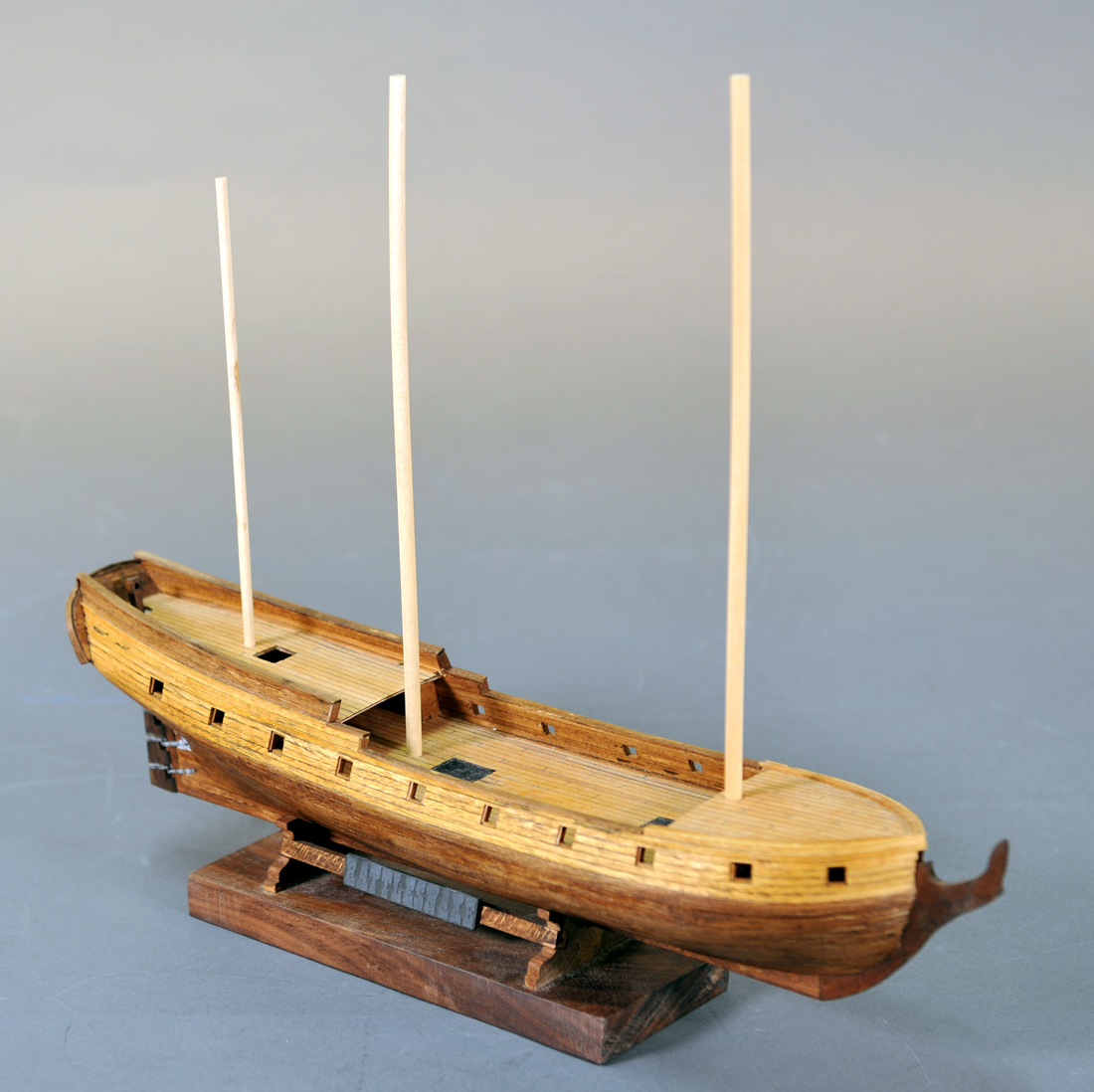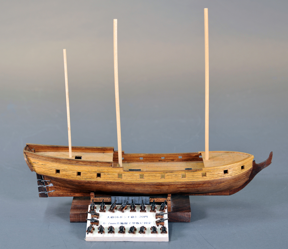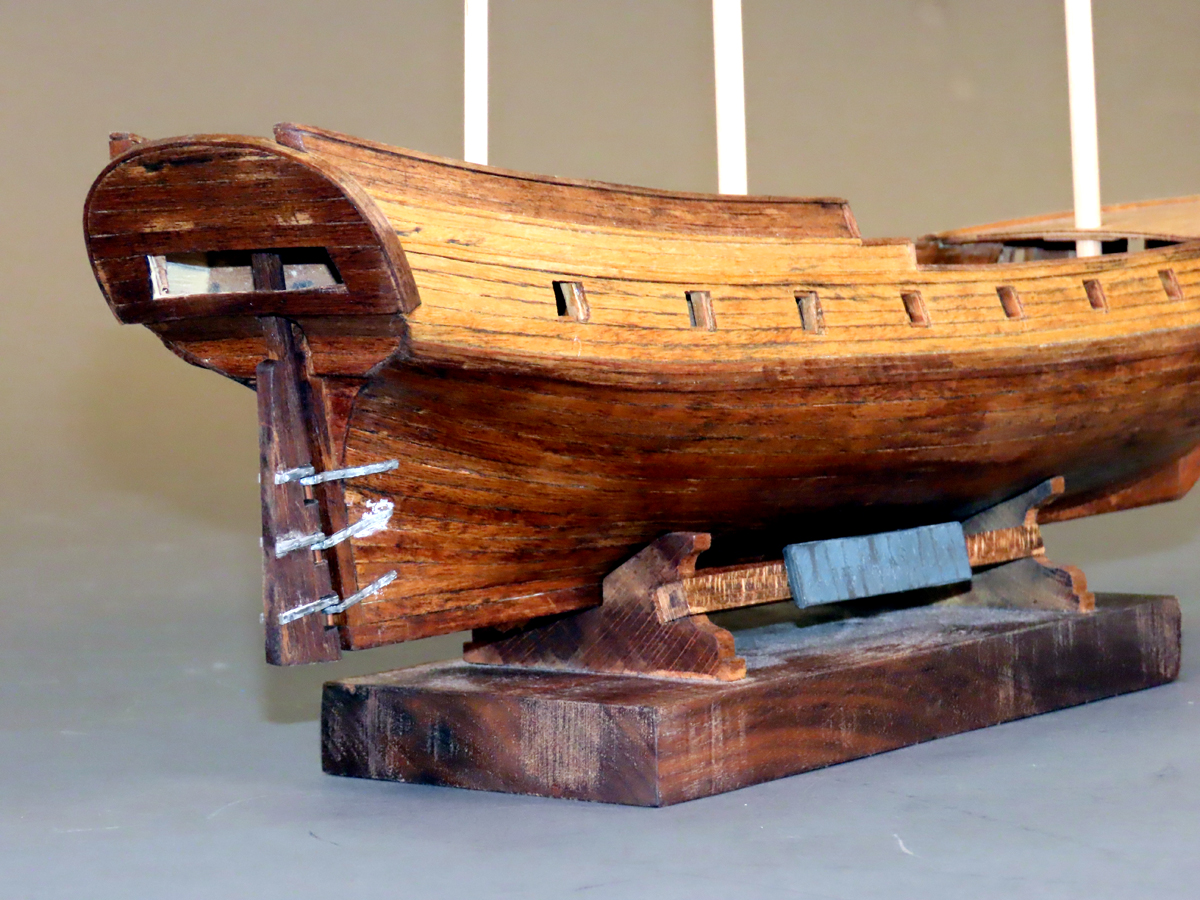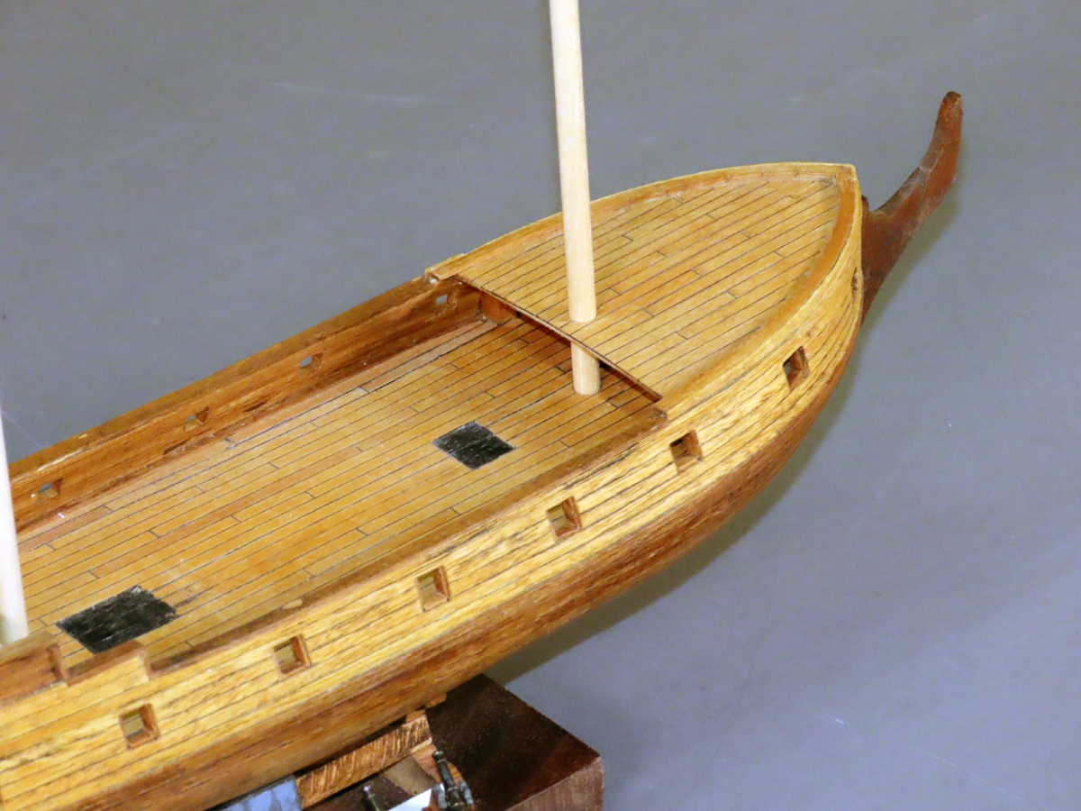 戦争中にイギリスに拿捕されて、正確な船図が採取されました。 本模型は2020年秋より造船開始、早くも5年が経ちました。 改造箇所は下記の通りです(予定を含む)。 @ キールをウォールナットに置き換え A 船尾はスクエアスターンに変更 B 甲板の板隙間には黒ケント紙挿入 C 舵は角材を貼り合せて製作 D 帆を製作 工程は遅れがちですが来年お盆竣工に向けて鋭意製作中です。 |